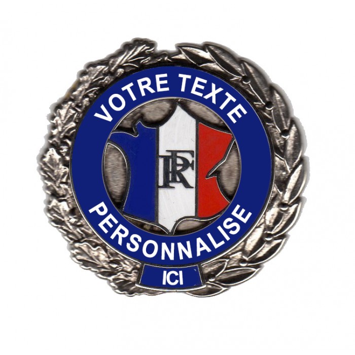 Médaille métallique émaillée 48 mm tricolore (bleu, blanc, rouge), avec la carte de France et l’inscription "RF".