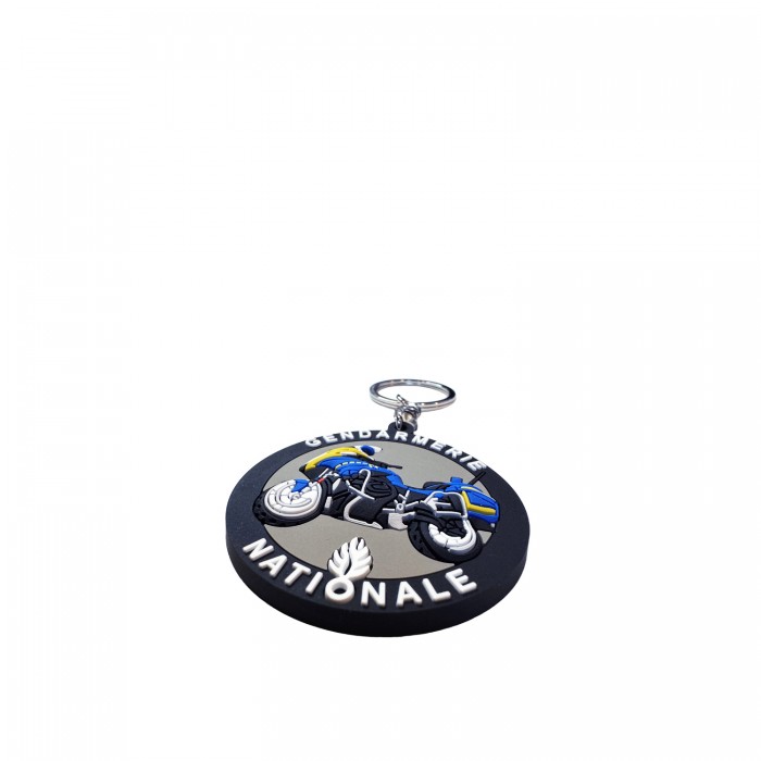 Porte-clés thermo-injecté Gendarmerie Nationale avec moto 3D en relief. Diamètre 55 mm. Maille tourillon 360°. Robuste et durable.