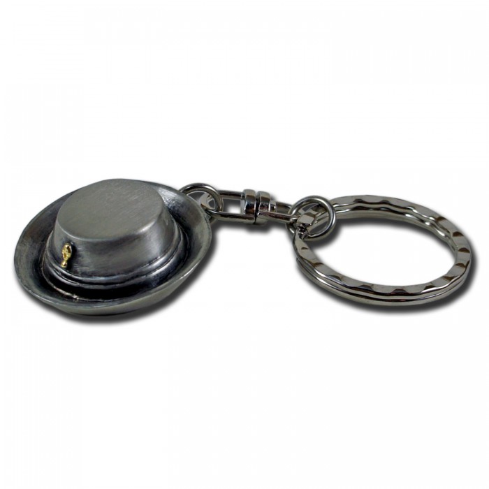 Porte clé métallique argenté en forme de chapeau de pervenche.