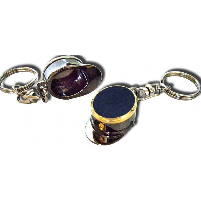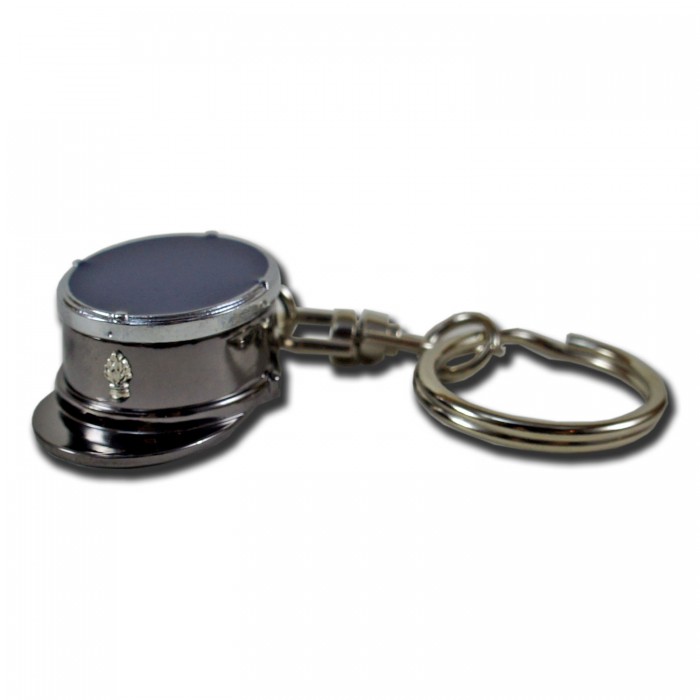Porte clé métallique argenté en forme de képi de gendarme, le haut du képi est en émaille bleu avec un liseré argenté.