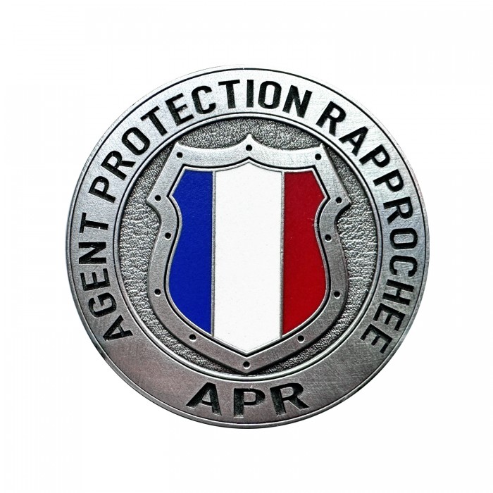Ce modèle inclut une médaille métallique 48 mm en relief représentant un écusson tricolore, avec la mention "AGENT PROTECTION RAPPROCHÉE – APR".