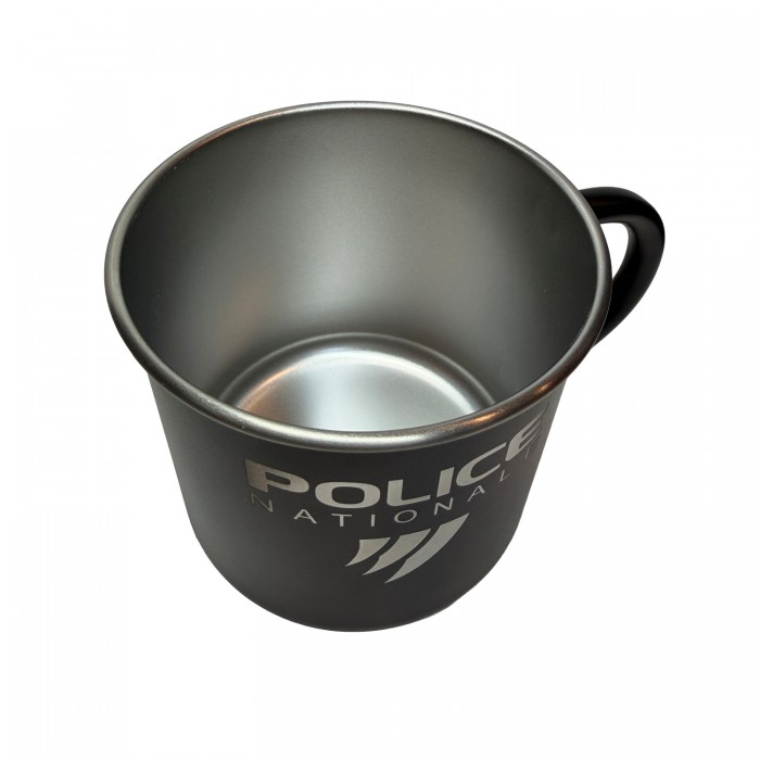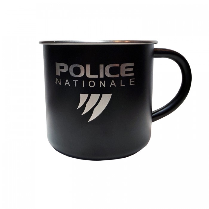 Mug métallique en acier inoxydable recyclé simple paroi, capacité 300 ml, gravure laser du logo Police Nationale 3 griffes sur une face. Disponible en noir, blanc, bleu marine et vert olive. Livré dans une boîte cadeau cartonnée.
