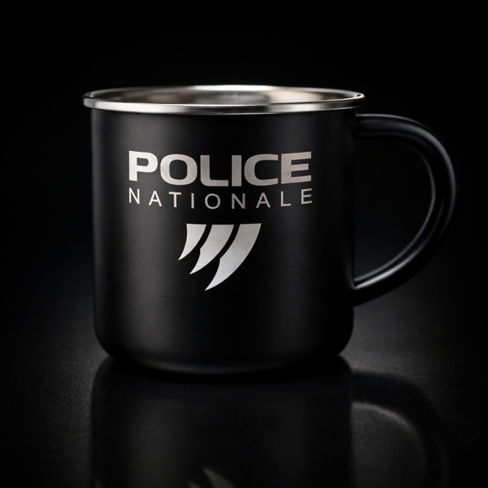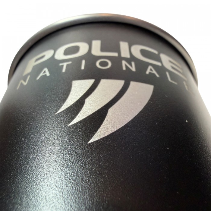 Le logo Police Nationale est gravé au laser sur une seule face du mug, offrant un marquage discret et durable directement dans le métal.