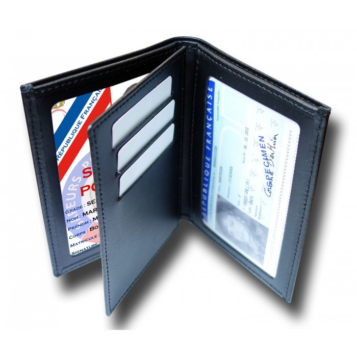 La premier partie du porte carte, laisse un emplacement protégé pour carte professionnelle. En face, un insigne métallique émaillé