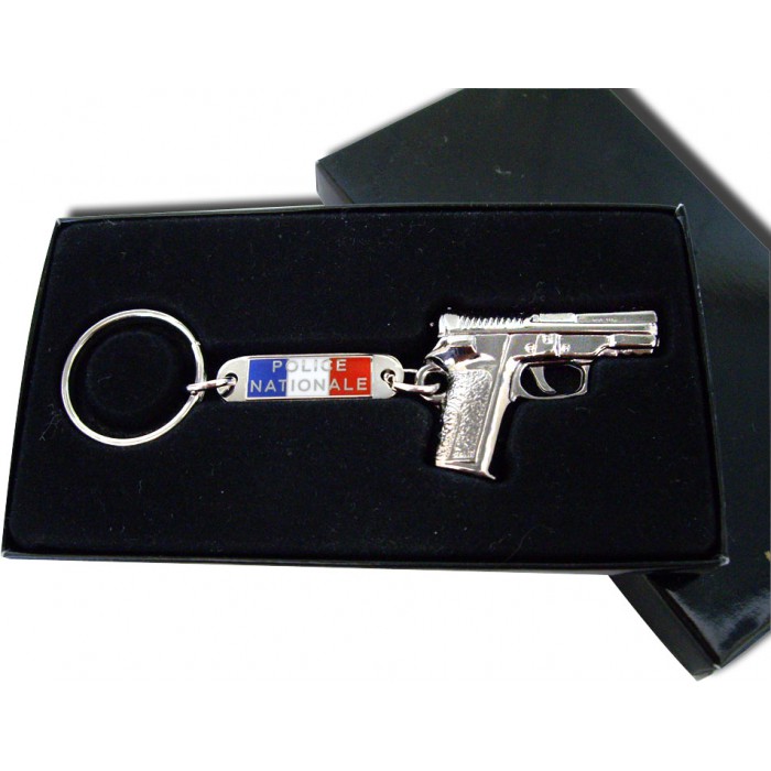 Ce porte-clés original en métal est conçu en forme de pistolet avec une finition réaliste. Il est accompagné d'une plaque tricolore émaillée portant l'inscription "Police Nationale", pour un rendu distinctif et représentatif.