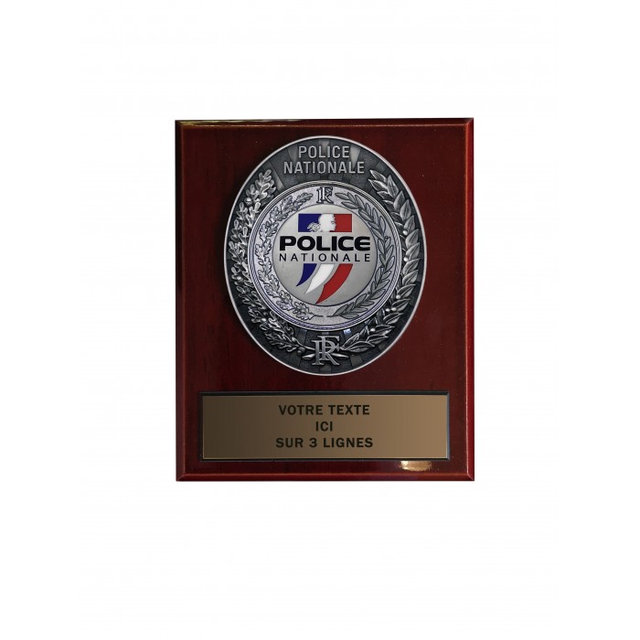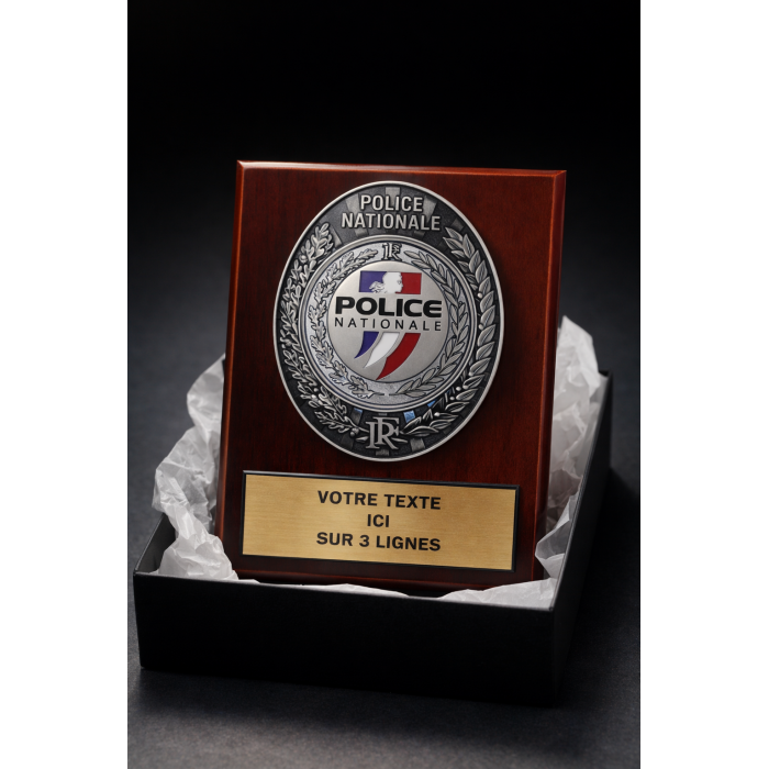 Cette composition premium met en valeur la véritable plaque de ceinture Police Nationale modèle FIT, montée sur un élégant présentoir en bois vernis, avec une plaquette personnalisée gravée sur 3 lignes.