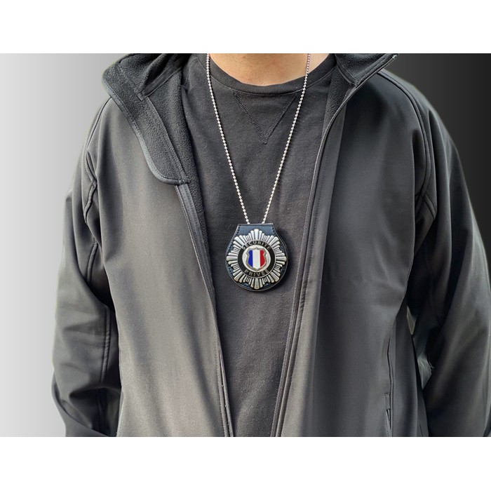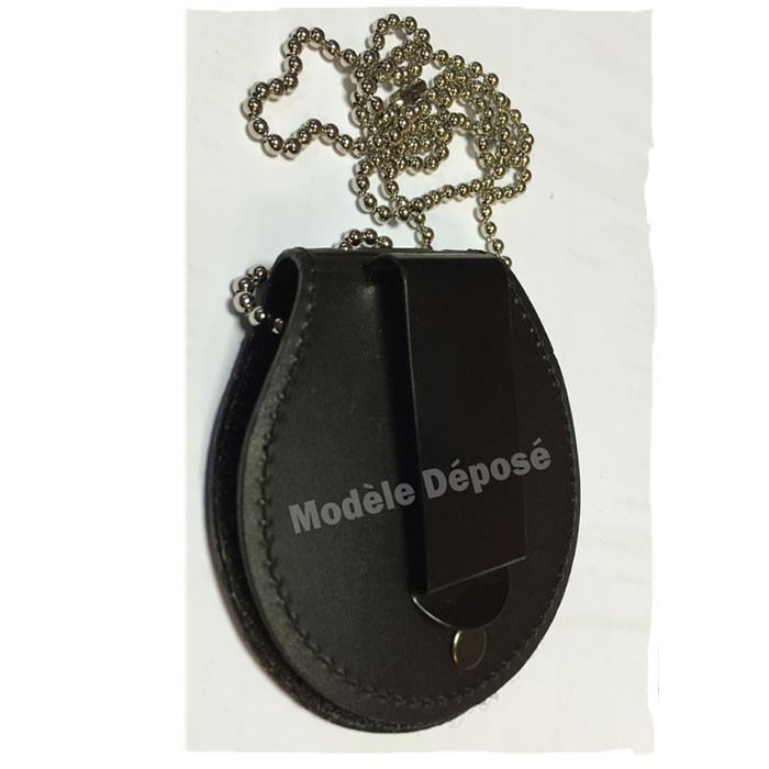 Fixation : double possibilité (clip acier serti au revers ou port autour du cou avec la chainette).
