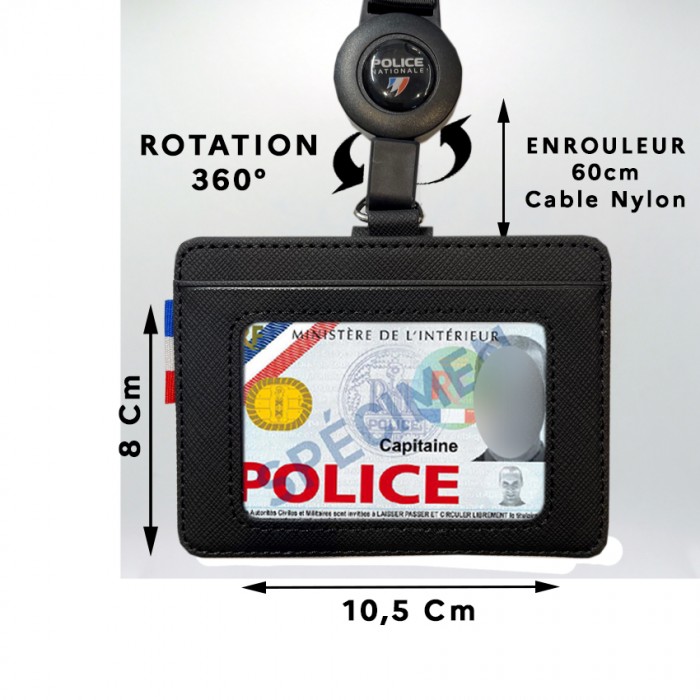 Enrouleur / derouleur Police Nationale fond Noir retractable (60cm cable nylon) attache renforcée