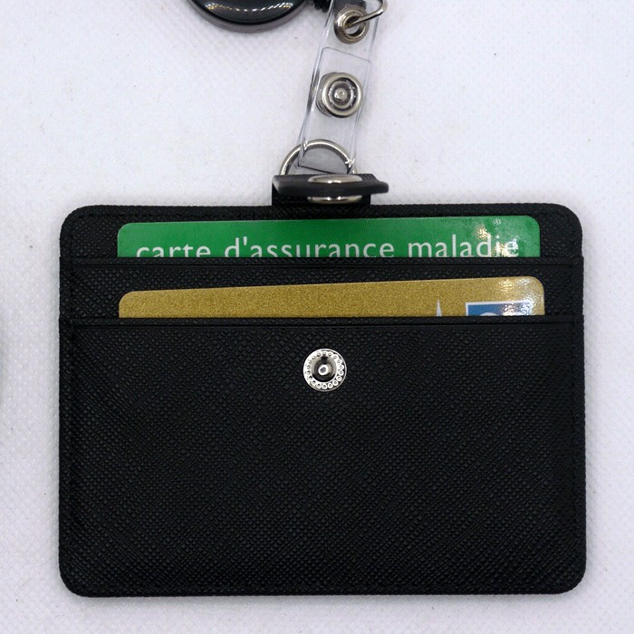 Le porte carte en pvc imitation cuir noir de 10,5 x 8 cm est accroché au tour de cou par un système a bouton pression. Le porte carte peut donc être remplacé individuellement de l'enrouleur et vice et versa.