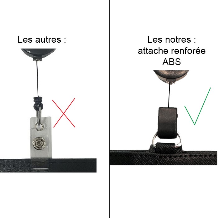 Tour de cou sécurisé avec enrouleur câble 60 cm et porte-carte PVC, compatible cartes professionnelles. Sécurité nuque, attache rapide et bouton pression.