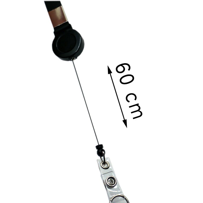 Le porte carte en pvc imitation cuir noir de 10,5 x 8 cm est accroché au tour de cou par un système a bouton pression. Le porte carte peut donc être remplacé individuellement de l'enrouleur et vice et versa.