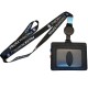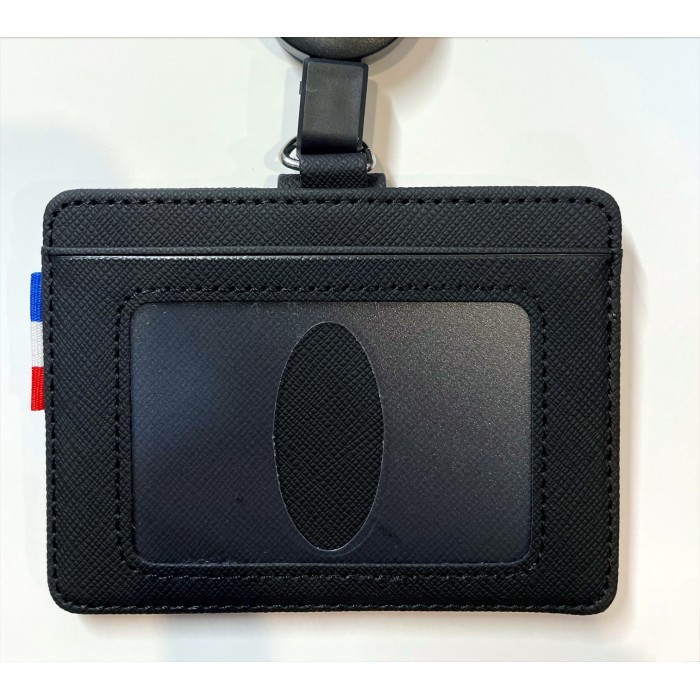 Le porte carte en pvc imitation cuir noir de 10,5 x 8 cm est accroché au tour de cou par un système a bouton pression. Le porte carte peut donc être remplacé individuellement de l'enrouleur et vice et versa.
